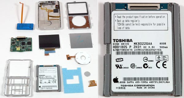 Qui vediamo l'"esploso" di tutte le componenti (la batteria non cambia rispetto a quella inclusa dell'iPod da 30 GB ma il display LCD è più sottile) e, accanto, una visione ravvicinata dell'hard disk di Toshiba da 80 GB, quello di cui vi parlavamo precedentemente, il modello MK8022GAA alto 5 millimetri solamente.