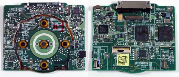 La scheda logica dell'iPod classic, sopra e sotto. Tre chip camuffati grazie al marchio di Apple e uno, il centrale, senza. Dall'altra parte nessun chip ma gli agganci per la rotella "cliccabile".