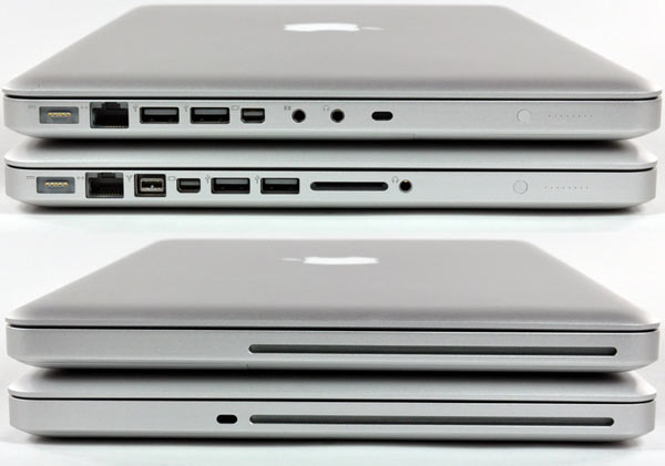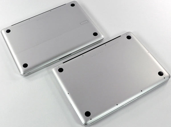 Si comincia subito con un paragone esteriore dei due lati del MacBook 13" (sopra) con il MacBook Pro 13" (sotto).