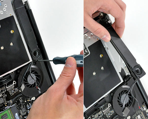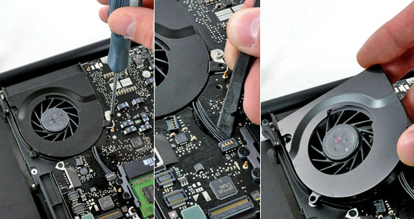 L'unica ventola che equipaggia il MacBook Pro 13" si scollega con tre viti e staccamdo il connettore.