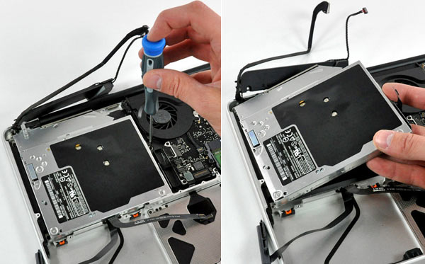 Il lettore/masterizzatore ottico CD/DVD che Apple chiama SuperDrive è un modello 8x fissato con tre viti. Nulla cambia in questa collocazione dal MacBook 13".