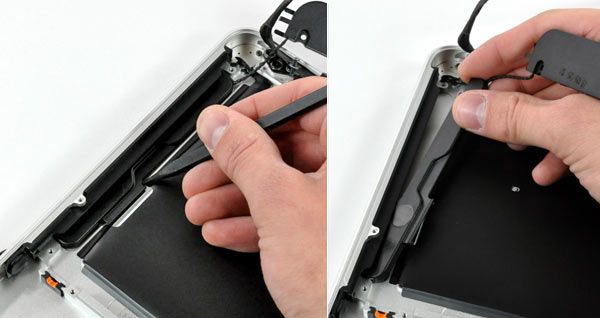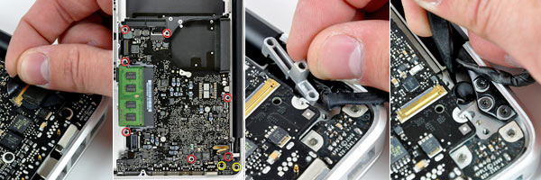 Per raggiungere la scheda logica bisogna prima staccare il connettore LVDS in questo angolo dietro alla presa elettrica MagSafe, poi togliere sette più due viti, scollegare il cavo del segnale per trackpad/tastiera/livello batteria ed infine pure il connettore del microfono.