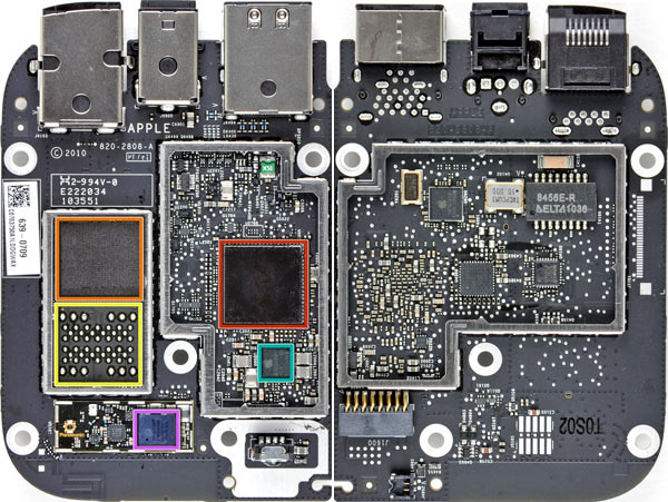Esattamente la stesso chip di memoria da 8 GB usato anche nell’iPad è pure nella Apple TV, unico posto dove mettere in cache lo streaming video proveniente da Internet. Apple non ha chiarito quanto fosse lo “storage” su memoria flash.