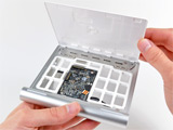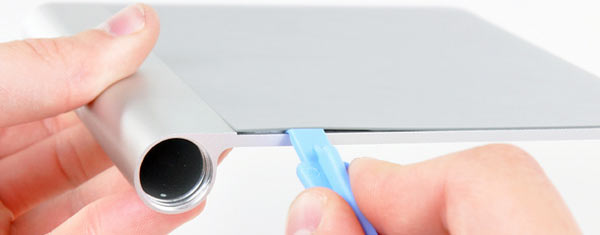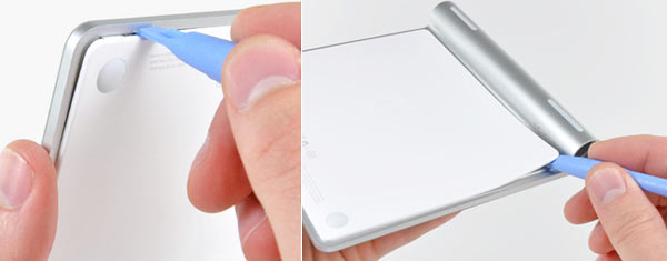 Dopo aver scaldato il pannello superiore si può fare leva, staccandolo dal resto dello chassis in alluminio.