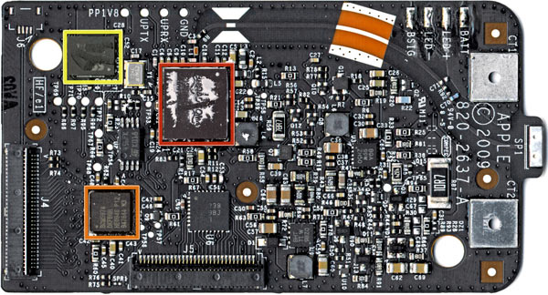 Sono tutti da un lato i chip e circuiti della scheda logica (marchiata 2009), si riconoscono: Broadcom BCM2042 (per il Bluetooth, in rosso), Broadcom BCM5974 (controller per il multi-touch, in arancio) e SST 25WF020 (memoria 2 Mb seriale).