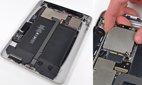 Come si nota lo spazio a disposizione è tutto occupato (innanzitutto dalla doppia batteria), non come nell’iPad con solo Wi-Fi che lasciava libero l’angolo in alto a destra, ora qui si trova la seconda parte della scheda madre, che gestisce il collegamento cellulare e quello satellitare.
