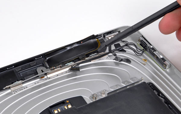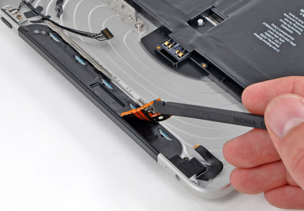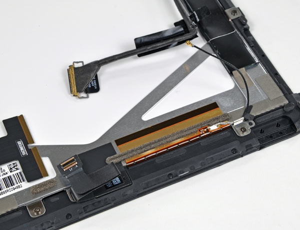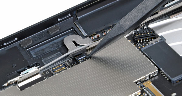 Questa antenna addizionale che si trova nell’iPad 3G si collega alla “cornice” nera del display e migliora la sfruttamentio della rete cellulare.