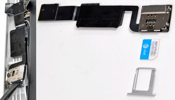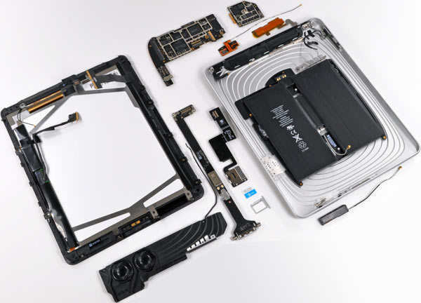 La costruzione modulare scelta da Apple prende forma in questa versione dell’iPad, che ha un modulo in più di quell’altra ed un paio di antenne aggiuntive, oltre allo slot per la microscopica scheda di rete cellulare.