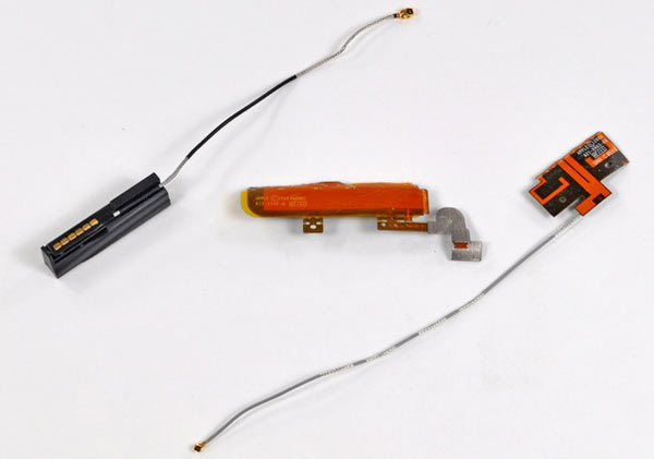 Queste sono le 3 antenne usate nell’iPad 3G: a sinistra quella per il Bluetooth/Wi-Fi (che a sua volta ne usa 3), al centro quella del GPS ed a destra quella della rete cellulare 2G/3G.