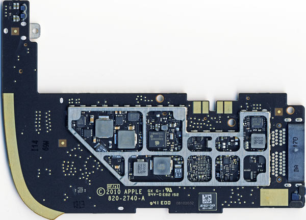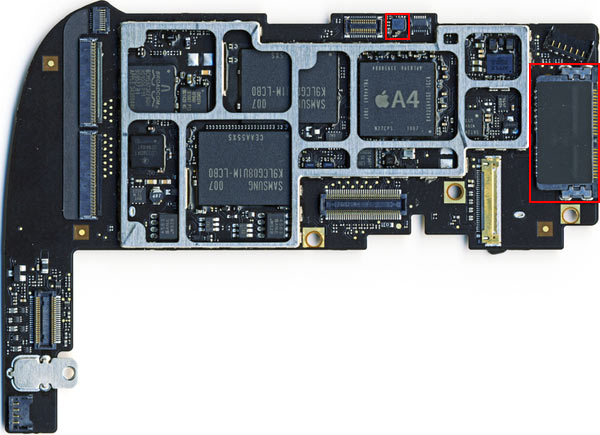 La scheda logica dell’iPad 3G si differenzia da quella dell’iPad Wi-Fi sono per le aree riquadrate in rosso: il piccolo chip vicino al processore A4 ed il connettore a destra che fa da ponte verso il pezzo di scheda logica che ospita la sezione cellulare/satellitare.