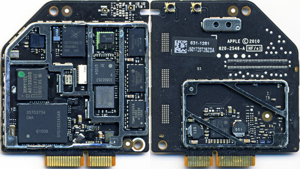Il piccolo componente aggiuntivo dell’iPad 3G contiene il processore Infineon X-GOLD 608 – PMB 8878 per la rete cellulare e l’accelerazione hardware della codifica multimediale (qui Apple ha simpaticamente cancellato la scritta del produttore, ma è quello più grande nella fotografia fronte/retro), il chip Broadcom A-GPS BCM47501UBG, il modulo d’alimentazione Skyworks SKY77340, il Numonyx 36MY1EE, altri amplificatori di potenza già visti dall’iPhone 3G in poi.