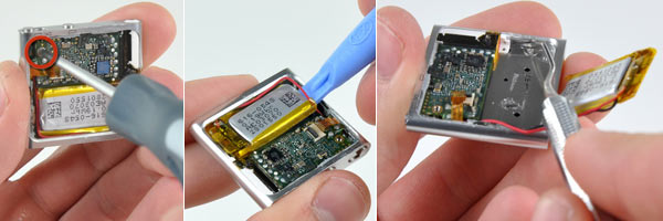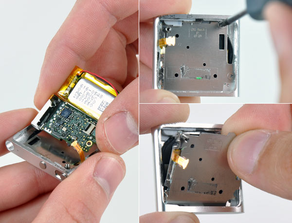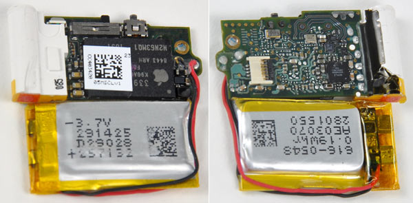 Scheda logica e batteria è tutto quello che troviamo dentro il nuovo iPod shuffle. E’ necessario solo disconnettere i tasti esterni e si può procedere.
