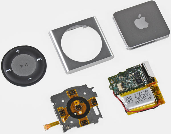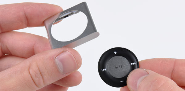 L’esploso rivela ben pochi pezzi per questo iPod shuffle, che nessuno riparerà ma andrà a sostituire se rotto. Una volta aperto è difficile rivederlo funzionante.