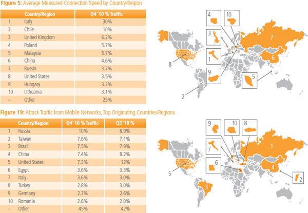 L’Isola di Man si colloca al primo posto in Europa per tasso d’adozione di banda larga al 96%, seguono Montecarlo, Romania, Svizzera, Bulgaria, Repubblica Ceca, Olanda, Belgio e Guernsey. In Italia, il 10% delle connessioni supera la velocità di 5 Mbps (rispetto al 7,7% del trimestre precedente), l’83% si colloca al di sopra dei 2 Mbps (82% nel trimestre precedente), mentre l’1,1% è al di sotto dei 256 Kbps (1,3% nel trimestre precedente). La velocità media di connessione in Italia nel quarto trimestre del 2010 si attesta sui 3,4 Mbps, con un aumento di 0,1 Mbps rispetto al terzo trimestre del 2010.