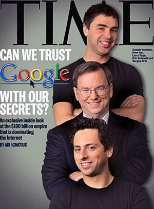 L’uomo che ha portato i fasti a Google, dando quell’impronta aziendale che necessitavano i co-fondatori Sergey Brin e Larry Page (rispettivamente sopra e sotto Schmidt, nella copertina di Time pubblicata a lato), mollerà al compimento del suo decennio di comando nell’azienda di Mountain View.