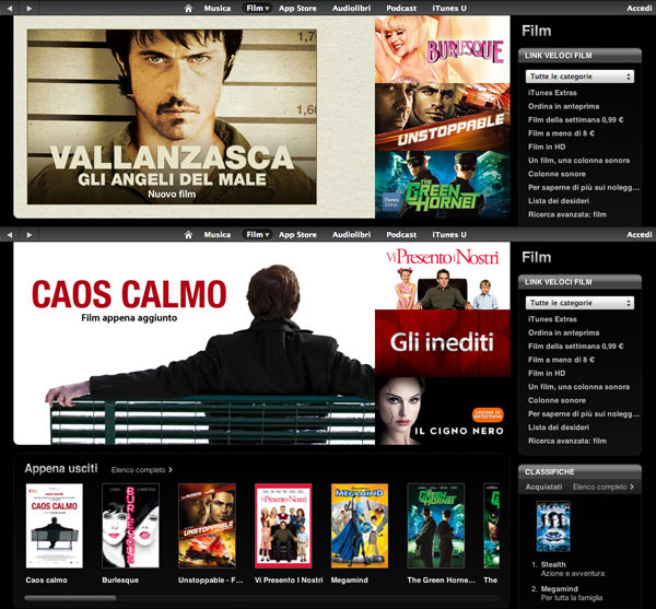Va bene, anzi benissimo la cinematografia di Hollywood, ma sono quindi per ora solo 2 pellicole quelle italiane nella divisione film di iTunes Store Italia. Speriamo che la categoria dei titoli nostrani (che ancora non esiste) aumenti, come è successo in altri iTunes nazionali.