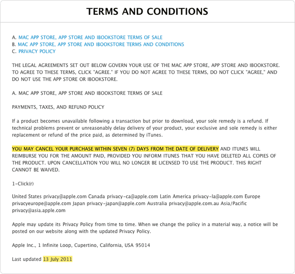 Grazie ad IDG News sappiamo che Apple ha formalizzato il recesso dall’acquisto delle applicazioni per iOS, entro 7 giorni vengono restituiti i soldi al cliente insoddisfatto.