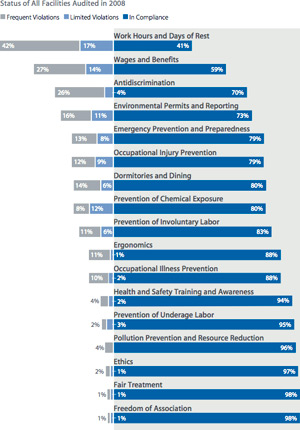 La relazione pubblicata da Apple lo scorso febbraio e relativa al 2008 evidenzia che nel 59% dei casi i fornitori obbligano i lavoratori a straordinari, oppure a saltare i giorni di riposo (il 42% ripetutamente ed il 17% saltuariamente).
