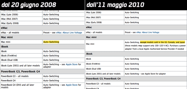 La nuova versione riporta informazioni importanti, in particolare per il Mac Mini si legge ora che le versioni vendute in USA, Canada e Giappone contemplano un alimentatore da 100-120 V e non quello con doppio voltaggio “universale” 100-240 V venduto altrove (Italia compresa).