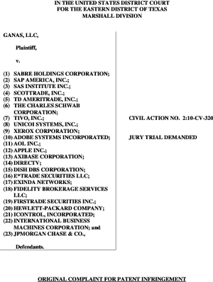 Le nuove accuse arrivano da Ganas contro 23 aziende (Adobe, AOL, Apple, Axibase, Charles Schwab, DirecTV, DISH DBS, E*Trade Securities, Exinda Networks, Fidelity Brokerage, Firstrade Securities, HP, IBM, iControl, JPMorgan Chase, Sabre, SAP, SAS Institute, Scottrade, TD Ameritrade, TiVo, Unicoi Systems e Xerox) in merito ai brevetti 7.007.094, 7.136.913, 7.325.053 e 7.734.756, registrati da questa ignota società, rappresentata dallo studio legale Antonelli Harrington & Thompson di Houston.