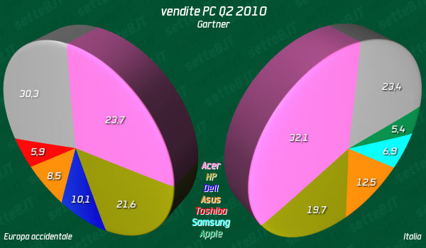 Il leader di mercato nel nostro continente è Acer con una quota del 23,7% e 3.696.000 unità (+29,9 in 12 mesi e leggermente superiore al 23,4% del trimestre precedente), HP ha il 21,6% con 3.376.000 unità (+12% sul Q2 del 2009 ma in calo rispetto al 22,6% del Q1), sul terzo gradino del podio Dell con il 10,1% e 1.572.000 unità (+2% sul Q2 del 2009 ed in leggera crescita rispetto al 10% del Q1), quarta ASUS con l’8,5% e 1.325.000 unità (+95,1% sul Q2 del 2009 ed in crescita rispetto al 7,9% del Q1), ultimo marchio censito è Toshiba al quinto posto con il 5,9% e 917.000 unità (+19,5% sul Q2 del 2009 ed una quota uguale a quella del Q1). Altri produttori totalizzano il 30,3% con 4.737.000 computer venduti (+12,5% sul Q2 del 2009 ed in leggera crescita rispetto al 30,2% del Q1). In totale i 15.622.000 PC venduti superano i 13.059.000 del secondo trimestre del 2009.