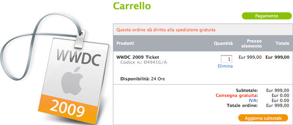 Sarebbe inoltre interessante conoscere l'opinione di qualche sviluppatore che si è iscritto finora per il WWDC, dato che da venerdì il prezzo del biglietto sarebbe dovuto aumentare rispetto agli scontati 1.200 euro, precedentemente indicati sull'Apple Store per l'Italia. Oggi il prezzo che leggiamo sull'Apple Store (perché i biglietti nella nottata erano ancora acquistabili se i posti sono esauriti?) è di 1.000 euro. Scriveteci.