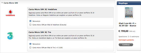 Anzi, addirittura, il principale carrier italiano non è elencato nell’Apple Store online al momento di acquistare gli accessori all’iPad 2. Si vedono solo le opzioni per aggiungere una micro SIM di Vodafone o di 3, ma non di TIM. Eppure il marchio della divisione mobile di Telecom Italia è elencata tra i fornitori riconosciuti.