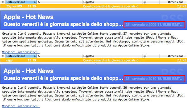 Questa mattina vi informavamo dell’apparizione dei banner del Black Friday (venerdì successivo al Thanksgiving, che è dopo domani) sul sito di Apple, ma oggi pomeriggio anche il feed RSS delle HotNews dell’azienda di Cupertino ha ricordato l’evento. Sembrava decisamente un déjà vu visto che lo stesso identico annuncio lo avevamo letto nel 2009 (e pazienza se nel frattempo sono usciti cosi che si chiamano iPad oppure Apple TV).