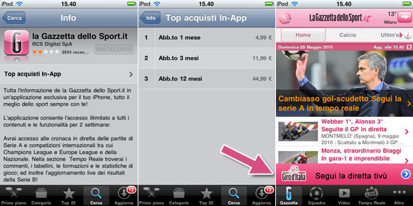 Come noto il software del giornale sportivo rosa è stato lanciato in dicembre nella versione gratuita e poi passato alla versione a pagamento. Ora è nuovamente gratuita ma si paga un abbonamento con il sistema dei micro-pagamenti (4,99/11,99/44,99 euro per 1/3/12 mesi) per leggere le notizie che sono gratis da un comune browser.