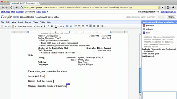 Come si vede dall’immagine sottostante più utenti possono collaborare alla stesura dello stesso documento comunicando in tempo reale tra loro le variazioni oppure i commenti. Il documento può essere consultato da 50 persone contemporaneamente, anche se usano iPhone, BlackBerry o smartphone con Android.