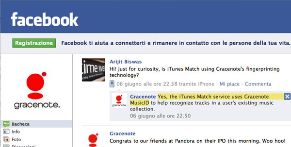 Tuttavia un “curioso” utente della pagina Facebook, notato da Cult of Mac, ha azzardato una domanda: “non è che iTunes Match usi la tecnologia di Gracenote?”, alla quale Gracenote ha immediatamente spiegato che in effetti sarà proprio MusicID a far riconoscere i brani al servizio “condono” di Apple, il quale provvederà a scaricare la canzone in versione legale, legittima e pure in alta qualità (iTunes Plus 256 Kbps).