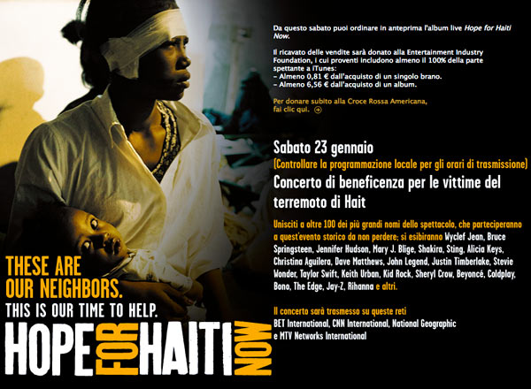 L’evento si chiama “Hope for Haiti Now: A Global Benefit for Earthquake Relief” e sarà trasmesso da quasi tutti i canali televisivi statunitensi e nel resto del mondo grazie alle versioni locali di MTV, National Geographic, CNN International ed altri. Streaming anche su Hulu, MySpace, YouTube ed altri.