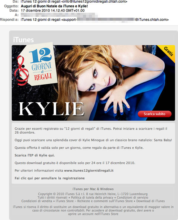 Aggiornamento del 17/12/2010: tutto regolare per questo download triplo fuori ordinanza, Apple non spiega il perché ce lo ha regalato in anticipo ma qui vale la regola del cavallo donato. L’email arrivata oggi pomeriggio annuncia la disponibilità delle canzoni, avete ancora poco meno di 10 ore per prenderle da iTunes Store.