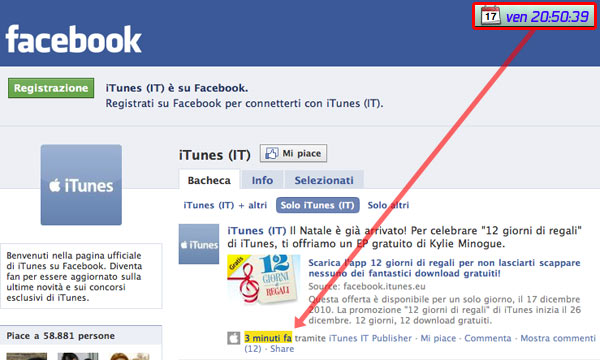 Aggiornamento del 17/12/2010: quasi alle ore 21 la pagina di Facebook di iTunes Store Italia si sveglia ed informa gli italiani che hanno poco più di 4 ore per scaricare il primo regalo, le altre 20 se ne sono andate.
