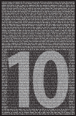 “Negli ultimi 10 anni, abbiamo imparato molto. Abbiamo imparato ad avere lo stesso entusiasmo ogni giorno, come se fosse il primo. Abbiamo imparato che dovevamo dare ai nostri clienti la stessa attenzione che loro danno a noi. Ed abbiamo imparato l’arte di assumere le giuste persone per la posizione migliore. Abbiamo imparato che è meglio adattarsi al quartiere piuttosto che aspettarsi che il quartiere di adattarsi a noi. E’ per questo che è necessario tanto tempo e ci vuole tanta energia. Il nostro primo negozio, a Tysons Corner, ci ha dato insegnamenti entro i primi 30 minuti. Avevamo appena aperto le porte che abbiamo subito notato come l’acciaio necessitava di essere lucidato. Con un liquido speciale per la lucidatura. Ed uno speciale strumento di lucidatura. Abbiamo appreso che l’acciaio lucidato con sabbia vergine lo rende meno sensibile ai graffi. Abbiamo anche appreso che il vetro può essere molto più di un semplice vetro. Abbiamo imparato che una scatola di vetro trasparente da 32 piedi e 6 pollici (9,9 metri) può innalzarsi tra i giganti della skyline di Manhattan. Quando il vetro diventa così iconico come il cubo della Quinta strada, può anche diventare il quinto punto di riferimento più fotografato a New York City. Ed abbiamo appreso che se è necessario, si può chiudere un’intera strada a Sidney per portare i blocchi di tre piani di vetro. E quando si crea vetro per tre piani, è anche necessario creare un impianto in grado di installare il vetro di tre piani. Abbiamo pure capito come realizzare i pezzi più grandi del mondo di vetro curvo per uno dei nostri punti vendita a Shangai. Abbiamo anche imparato più di un paio di cose sulla pietra. Come il modo di rivelare il vero colore del granito grazie alla fiamma ossidrica. E che a volte il granito ha venature di colore che devono essere abbinate. Abbiamo anche imparato che ottenere questi dettagli perfetti può essere difficile come spostare una montagna. A volte due. Ma alla fine, lo sforzo vale la pena. La combinazione di acciaio, vetro e pietra può creare spazi davvero unici e stimolanti. Abbiamo capito anche che trovare il giusto design per i nostri negozi è fondamentale. Ci siamo spinti a costruire in un parcheggio di Cupertino la facciata del negozio di Regent street in scala reale, per essere sicuri che il progetto fosse giusto. Questo ci ha insegnato il valore di vedere le cose nelle dimensioni vere. Una volta abbiamo avuto l’idea che i mini-negozi avrebbero offerto il massimo della convenienza. Poi ne abbiamo costruito uno. Ma abbiamo imparato che più è grande e meglio è. Ed abbiamo imparato che anche quando i nostri negozi sono grandi, nessun dettaglio è troppo piccolo. Questo lo abbiamo imparato ripristinando le oltre 500.000 tessere dei mosaici del negozio all’Opéra di Parigi. Abbiamo anche appreso che il nostro cliente tipo ama gli spazi aperti, con scale di vetro e tavoli di rovere artigianali. E che questi spazi non hanno bisogno di odorare come alberi di pino o pomodori per essere invitanti. Siamo costantemente al lavoro per rendere i nostri negozi più furbi, più iconici e più innovativi. E siamo tremendamente orgogliosi di ciascuno. Siamo orgogliosi dei nostri punti vendita non solo perché sono di successo, ma perché ci hanno insegnato molto. Tutta la strada fatta dagli Apple Store ha fatto di Apple una forte azienda. Negli ultimi 10 anni, abbiamo imparato che i nostri negozi sono per i nostri clienti l’incarnazione del marchio Apple. Ora, i nostri clienti sono la ragione unica per i quali noi siamo qui, quindi dedichiamo a loro qualche parola. Nel corso della nostra attività abbiamo aperto nel 2001 il negozio di Tysons Corner, tutti gli altri comunicavano poco con la loro clientela. Il che ci ha fatto pensare che probabilmente avremmo dovuto parlare di più con loro. Possibilmente faccia a faccia. Così abbiamo colto ogni opportunità per iniziare una conversazione ad ogni occasione possibile. Parliamo mentre provano i prodotti sui tavoli. E quando arrivano per un seminario. Queste conversazioni ci hanno insegnato che i clienti amano i nostri prodotti, ma ciò che realmente vogliono è fare un album di foto della loro famiglia. Vogliono fare un video dei bambini. Oppure un sito sul viaggio nel paese. Ci è stato insegnato che i negozi Apple possono e devono essere i centri per la creatività. Ed abbiamo capito grazie a programmi come Apple Camp e Workshop per i ragazzi che la creatività non dipende dall’età. I filmati e le presentazioni che abbiamo visto fare dai bambini sono la prova che tutto quello che serve sono gli strumenti giusti ed un’idea. E dobbiamo fare le cose fatte bene, perché i sorrisi dei bambini devono essere grandi come i nostri. Abbiamo anche appreso che i musicisti sono in grado di registrare un album capace di andare in cima alla classifica, nei nostri negozi. E che i famosi registi non sono solo interessati ai nostri computer, ma anche ai workshop. Abbiamo imparato molto su come ci si diverte. Ed abbiamo imparato che i nostri clienti amano utilizzare i nostri prodotti pure per il lavoro. L’esperienza ci ha insegnato che avere un solo Pro Day a settimana dedicato alla clientela aziendale non è sufficiente. Dobbiamo essere aperti per vendere ogni giorno. E dobbiamo avere spazi dedicati alle sessioni di formazione lavoro, workshop ed eventi. Abbiamo imparato che ogni membro dello staff debba essere flessibile alle esigenze di un cliente aziendale, come per le esigenze di qualsiasi altro cliente. Milioni di conversazioni avute con i clienti di ogni genere ci hanno insegnato che non si tratta di far sentire alle persone quanto un computer o un telefono li ami. Questo è impossibile. Invece, si tratta di dare alle persone gli strumenti per fare ciò che amano. Ed abbiamo imparato a creare programmi sorprendenti come One to One e la Configurazione personalizzata per dare alle persone le possibilità. Abbiamo creato programmi come questi per so