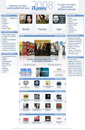 Il meglio di iTunes 2008 in Italia vede primeggiare l'album "Viva la vida or death and all his friends" di Coldplay. Nella categoria pop le canzoni più vendute risultano essere "Novembre" di Giusy Ferreri, "Invece no" di Laura Pausini e "Alla mia età" di Tiziano Ferro. I brani rock più venduti sono stati "Chinese democracy" di Guns N' Roses, "The ghost of Tom Joad (live)" di Bruce Springsteen & The E Street band e "Man-sized wreath" di R.E.M.. Sul podio della musica alternativa ci sono "Il vento" di Subsonica, "Studentessi" di Elio e le Storie Tese con "Charlie fa surf" di Baustelle. Il meglio dei brani jazz è rappresentato da "When the sun comes down" di Incognito, "Se ne dicon di parole" di Giuliano Palma & The Bluebeaters e "Milano" di Marcus Miller, Stanley Clarke & Victor Wooten. Tra le colonne sonore hanno avuto successo le raccolte di "Twilight", "High School Music 3" e "Tabarly".