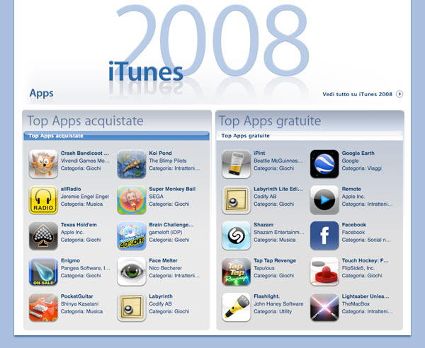 Il meglio di App Store 2008 indica il gioco "Crash Bandicoot – Nitro Kart 3D" (5 euro) in cima alla classifica dei software per iPhone/iPod touch venduti da iTunes mentre "iPint" è l'applicazione gratuita preferita nel nostro paese. I giochi fanno la parte del leone.