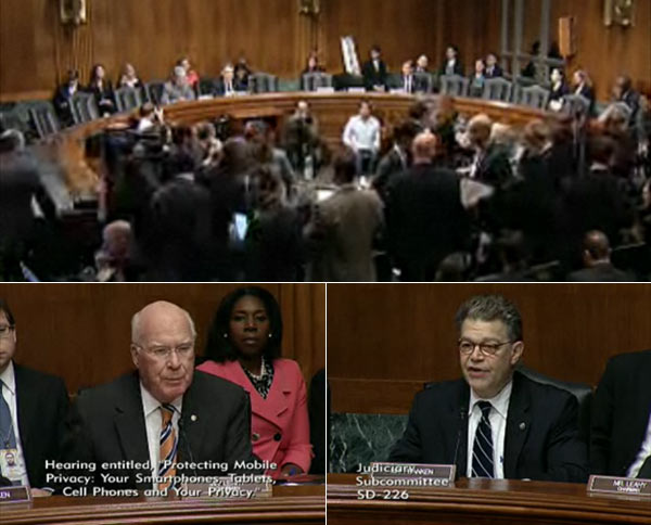 Il senatore Al Franken (a destra nell’immagine sottostante, accanto al presidente del subcomitato Patrick Leahy) ha insistito che queste tecnologie sono utili e che danno agli utenti incredibili benefici, complimentandosi spesso con i creatori di prodotti come iPhone, iPad e Google Maps: “you guys are brilliant” (siete geniali).
