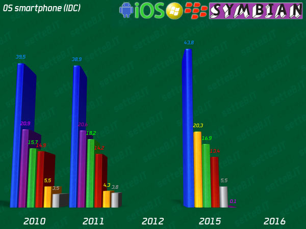 Con questi numeri il leader Android crescerà quindi del 23,7% tra il 2011 ed il 2015 per unità vendute, Windows Phone dell’82,3%, iOS del 17,9%, BlackBerry del 18,3% e Symbian precipiterà ancora più in basso con un decremento del 68,8%.