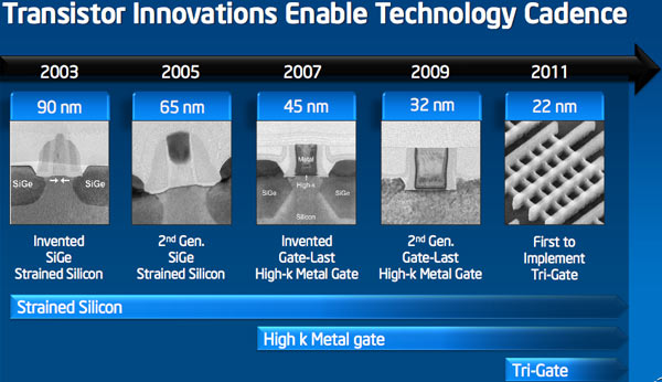 Oltre ai 20 nm per le memorie NAND sviluppate da Intel assieme a Micron, questa del transistor tridimensionale che usa la tecnologia Tri-Gate è la grande novità nell’evoluzione tecnologica. Si passa da una struttura bidimensionale a quella tridimensionale (allo studio dal 2002).