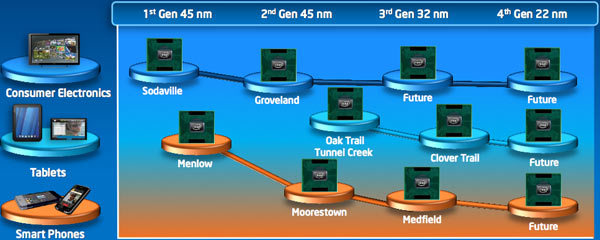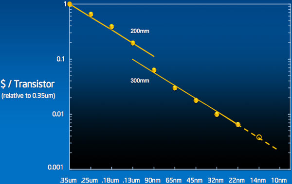 La roadmap di Intel, che segue i dettami della Legge di Moore del 1965 (raddoppio dei transistor del chip ogni 24 mesi), prevede di raggiungere i 14 nm nel 2013 ed i 10 nm nel 2015. Di conseguenza dovrebbe scendere anche il prezzo per transistor.