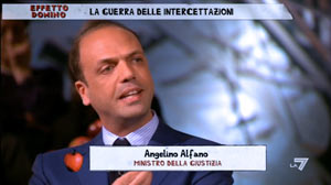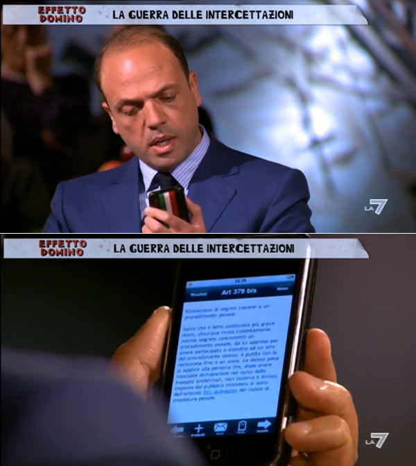 L’agrigentino Angelino Alfano doveva difendere ad “Effetto domino” la nuova legge sulle intercettazioni e sulla fuga di notizie nelle investigazioni ed ha citato Sciascia, ma evidentemente non bastava, allora ha aggiunto: “scusate ma qui ho tutte le leggi nell’iPhone”. Stupore della conduttrice che ha commentato così: “tecnologico il ministro”, mentre lui si accingeva a leggere l’articolo 379 bis del Codice Penale.