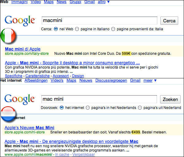 Su Google Italia abbiamo cercato "Mac mini" e nulla d'interessante è apparso tra i link sponsorizzati, tuttavia con "macmini" arriva il link sponsorizzato di Apple ma con il prezzo attuale di 599 euro.