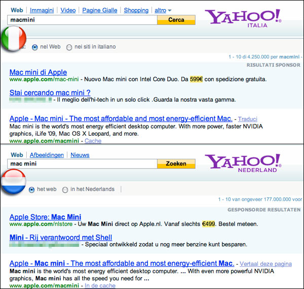 Le medesime ricerche le abbiamo fatte su Yahoo!, sempre nelle versioni nazionali di Olanda ed Italia.