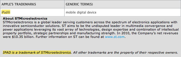STMicroelectronics scrive che IPAD è ancora un loro marchio registrato, l’acronimo significa Integrated Passive and Active Devices. Per la verità anche nella lista dei marchi usati da Apple, alcuni di proprietà (come il discusso App Store ed iAd) o presi in licenza (come iOS ed iPhone da Cisco, compreso il dominio iphone.com), c’è l’iPad.