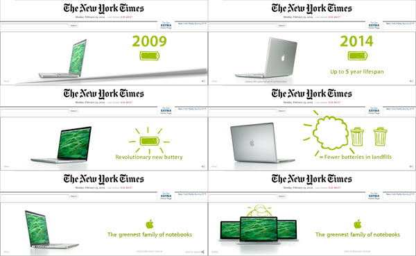 Al termine della pubblicità, che non sparisce dalla home page del New York Times, si affiancano al modello da 17 pollici (che è in consegna da pochissimi giorni) quello da 15 e 13 pollici, che assieme costituiscono la "famiglia di laptop più verde".