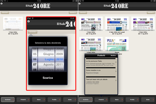 Il quotidiano economico con le pagine di colore beige (che su iPad è però bianco, peccato) fa scegliere dall’edicola virtuale quali copie scaricare, sono disponibili quelle dell’ultima settimana. Oltre all’edizione odierna si possono leggere gli arretrati fino al 6 luglio, in teoria però. Nella nostra prova dopo 5 copie (4 giorni più l’allegato Plus24) il tentativo di scaricare la sesta ha mandato più volte in crash l’applicazione.