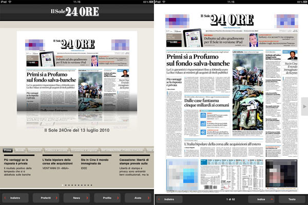 L’applicazione gratuita “Il Sole 24 ORE” in versione 1.1 è pronta per iPhone e per iPad. E’ riproposto in tutto e per tutto il PDF del giornale, niente multimedia o segni di interazione con l’utente, semplicemente non ci si sporca le mani d’inchiostro.