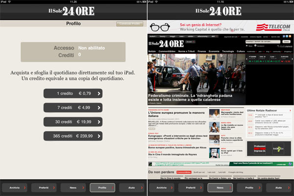 Per le prime 2 settimane di vita sui dispositivi mobile Il Sole 24 ORE è consultabile gratuitamente, grazie ad una sponsorizzazione, poi bisognerà acquistare i crediti dentro all’applicazione, validi indipendentemente dall’uso di un iPhone/Pod touch o di un iPad. Ogni copia costerà 0,80 euro (circa la metà del giornale di carta), 5 euro a settimana, 20 euro al mese o 240 euro all’anno. Nell’immagine vi mostriamo ingranditi i prezzi.