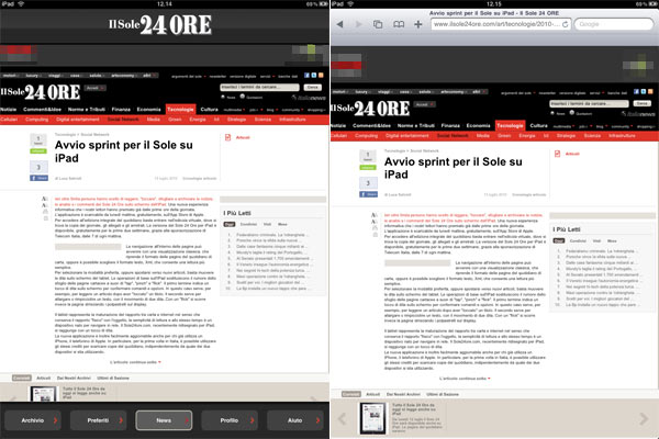 Ecco il confronto tra una notizia letta sul sito del quotidiano con l’applicazione in oggetto (a sinistra) e la stessa vista dal browser Safari. Sono identiche.